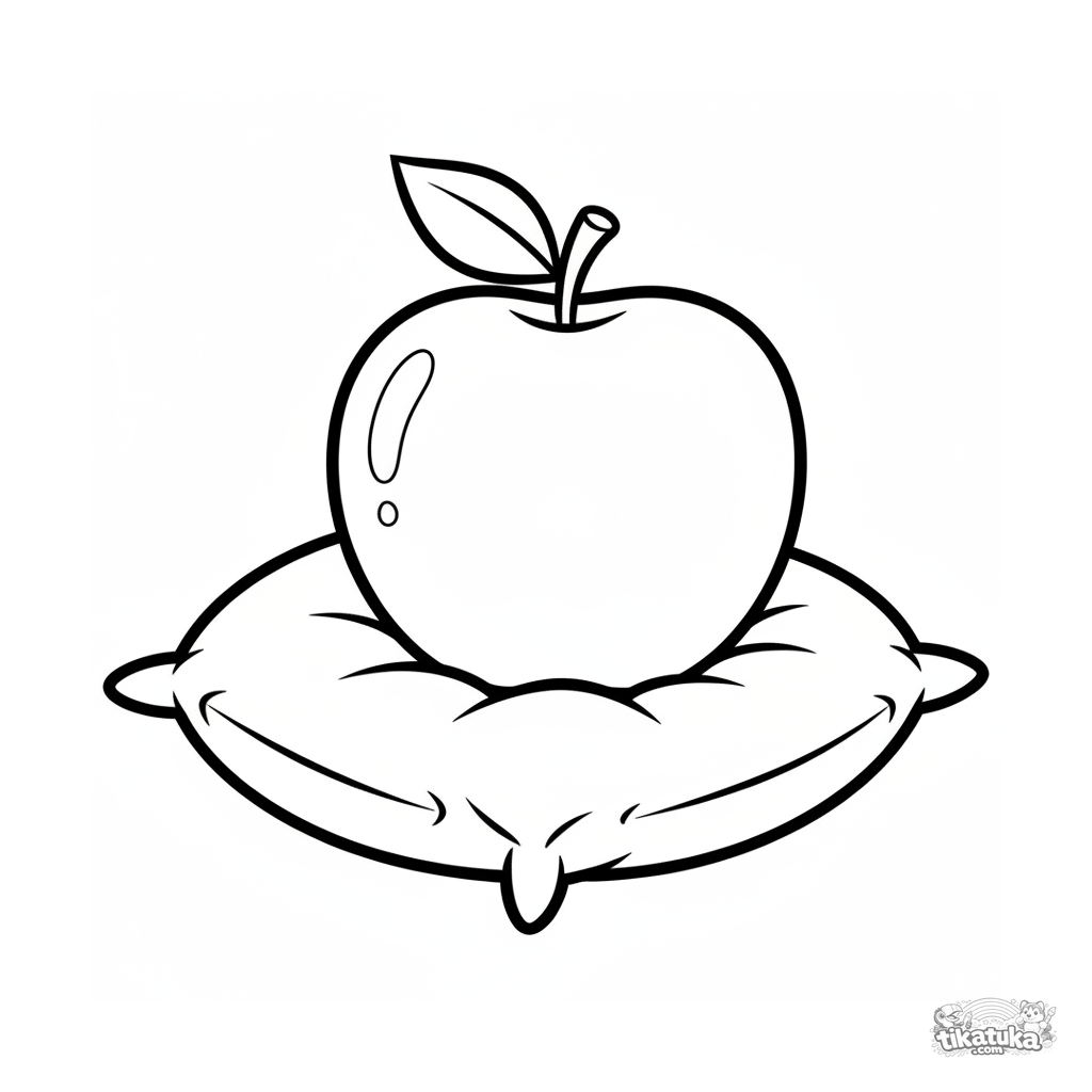 Página para colorir realista para bebês: uma maçã grande e simples descansa em um travesseiro. Contorno claro, formato reconhecível.