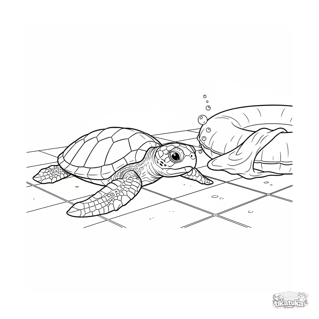 Página detalhada para colorir para crianças 10-12: uma pequena tartaruga bebê retratada de forma realista explorando os azulejos no fundo de uma piscina perto de um anel inflável.