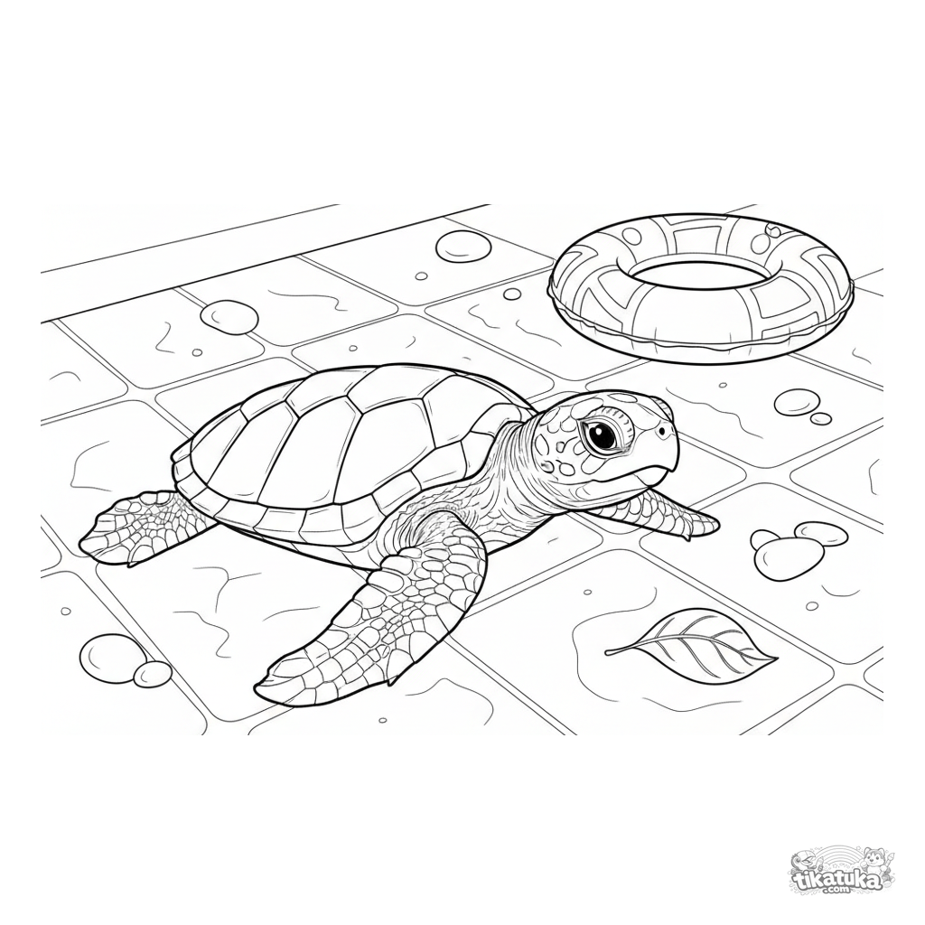 Página detalhada para colorir para crianças de 10 a 12 anos: uma tartaruga bebê realista explora um anel inflável no fundo da piscina.