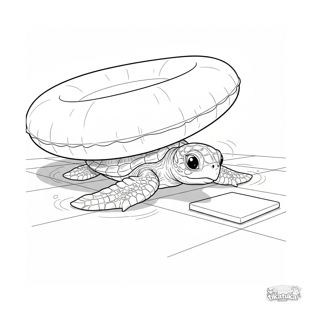 Página detalhada para colorir para crianças de 10-12 anos: uma tartaruga bebê realista explora o espaço sob um anel inflável no fundo da piscina.