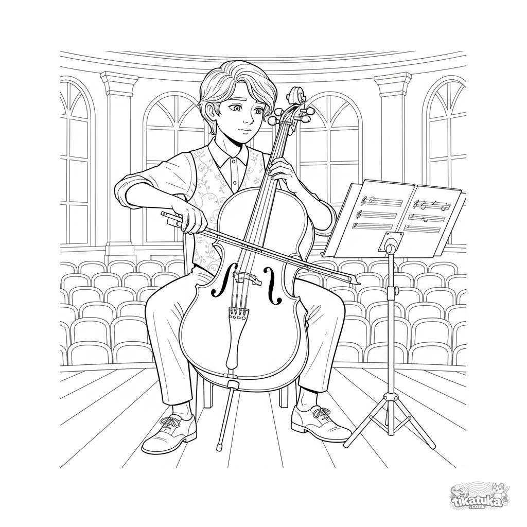 Página realista para colorir para crianças mais velhas 10-12: um violoncelista tocando música em um palco de sala de concertos.
