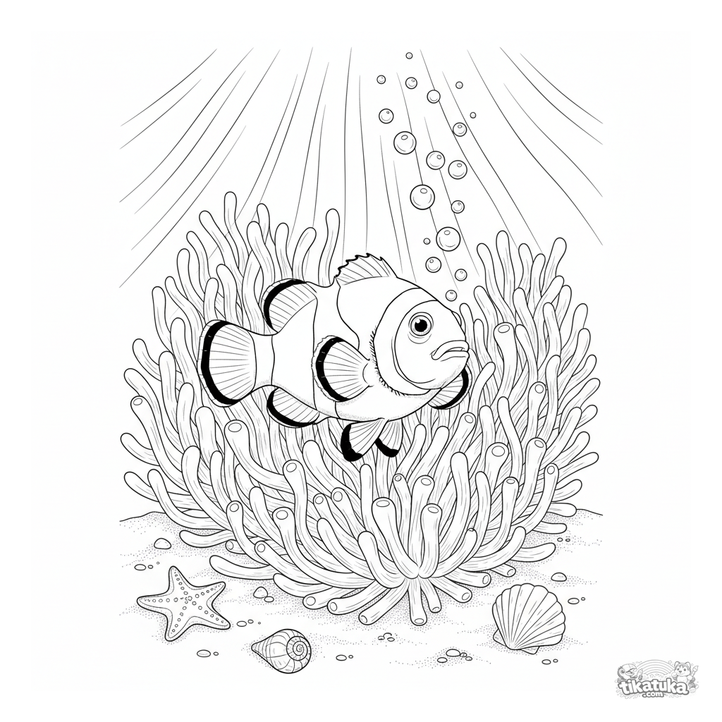 Página para colorir de um peixe-palhaço realista entre anêmonas e corais. Para crianças mais velhas de 7 a 12 anos.