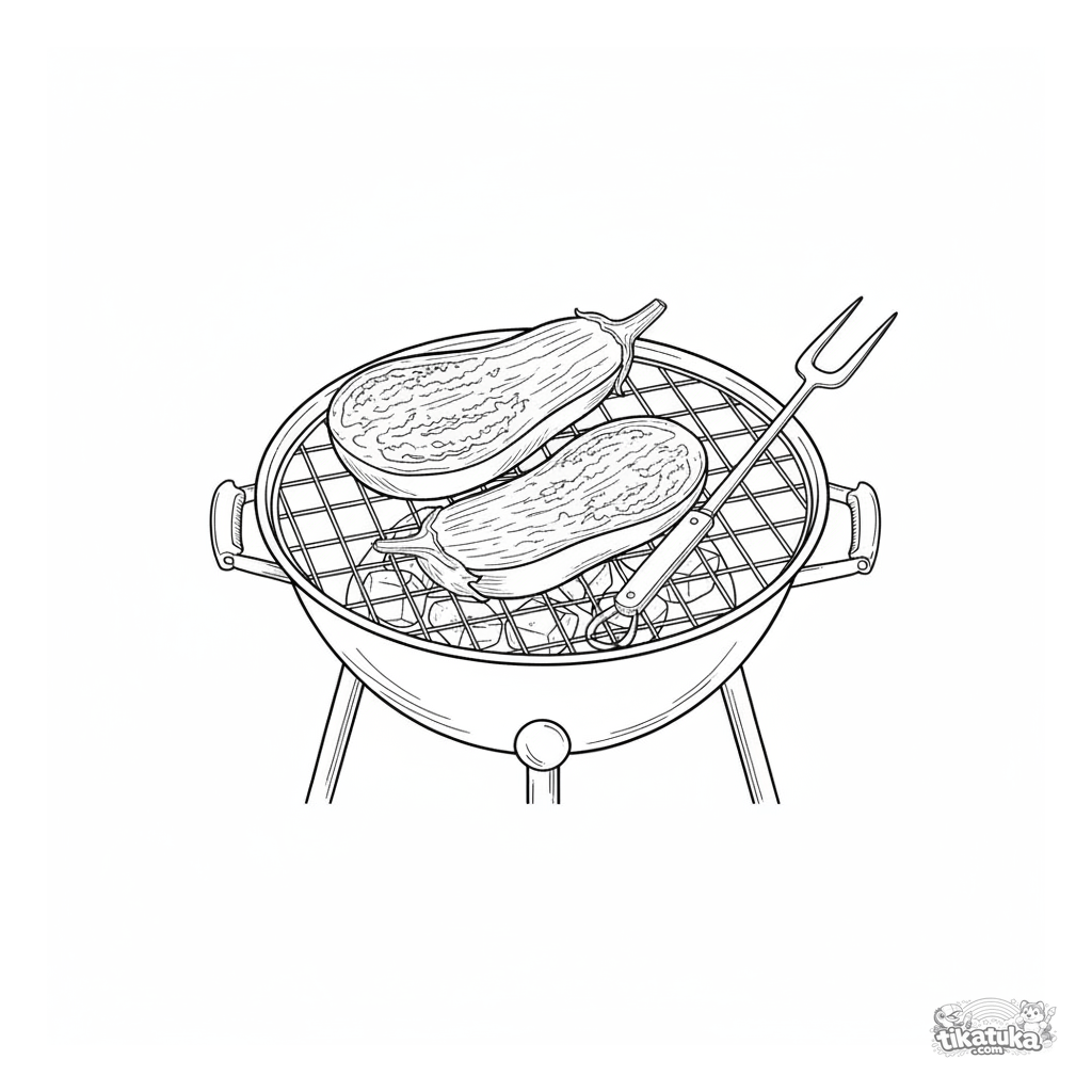 Página para colorir detalhada estilo gravura: metades de beringela em uma grelha de carvão de jardim. Para 10-12 anos.