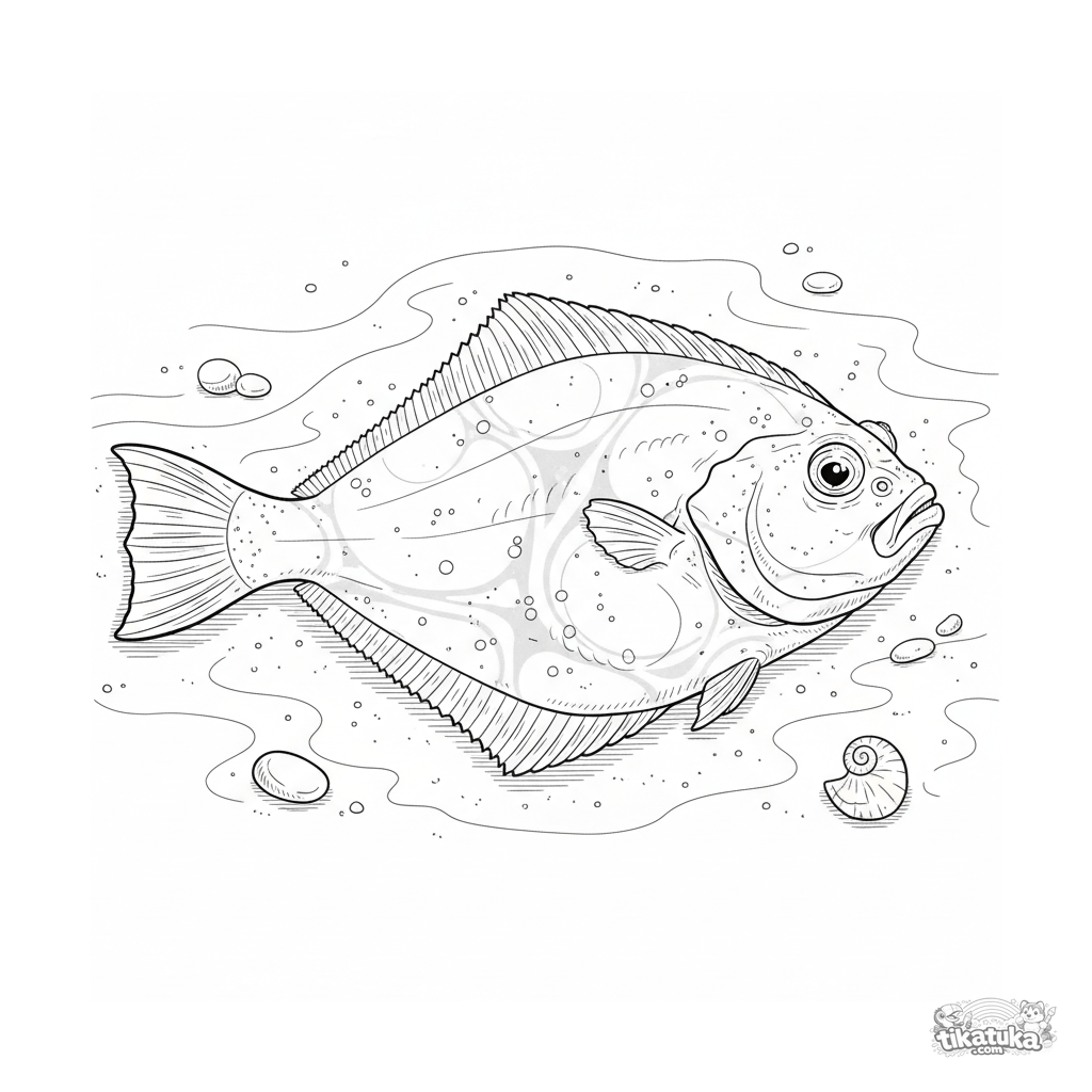 Página para colorir detalhada para crianças maiores de 10-12: um linguado realista camuflado no fundo arenoso ao sol. Alto detalhe.