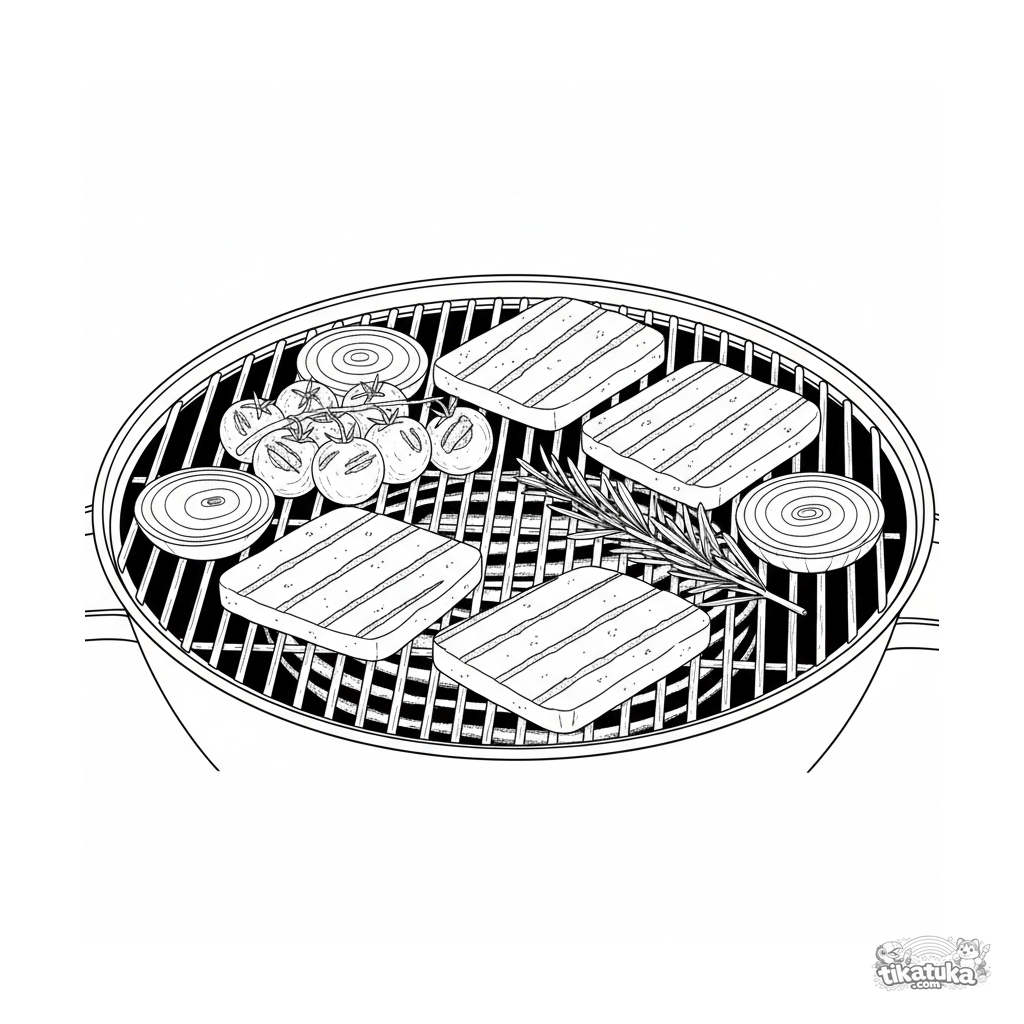 Página para colorir realista e detalhada de queijo halloumi e legumes em uma grelha de jardim. Para 10-12 anos.