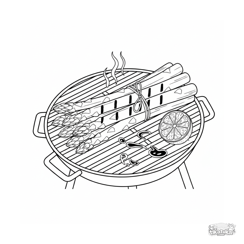 Página para colorir realista complexa para crianças mais velhas 10-12: um maço de aspargos com marcas de grelha detalhadas, pingos de azeite e uma fatia de limão.