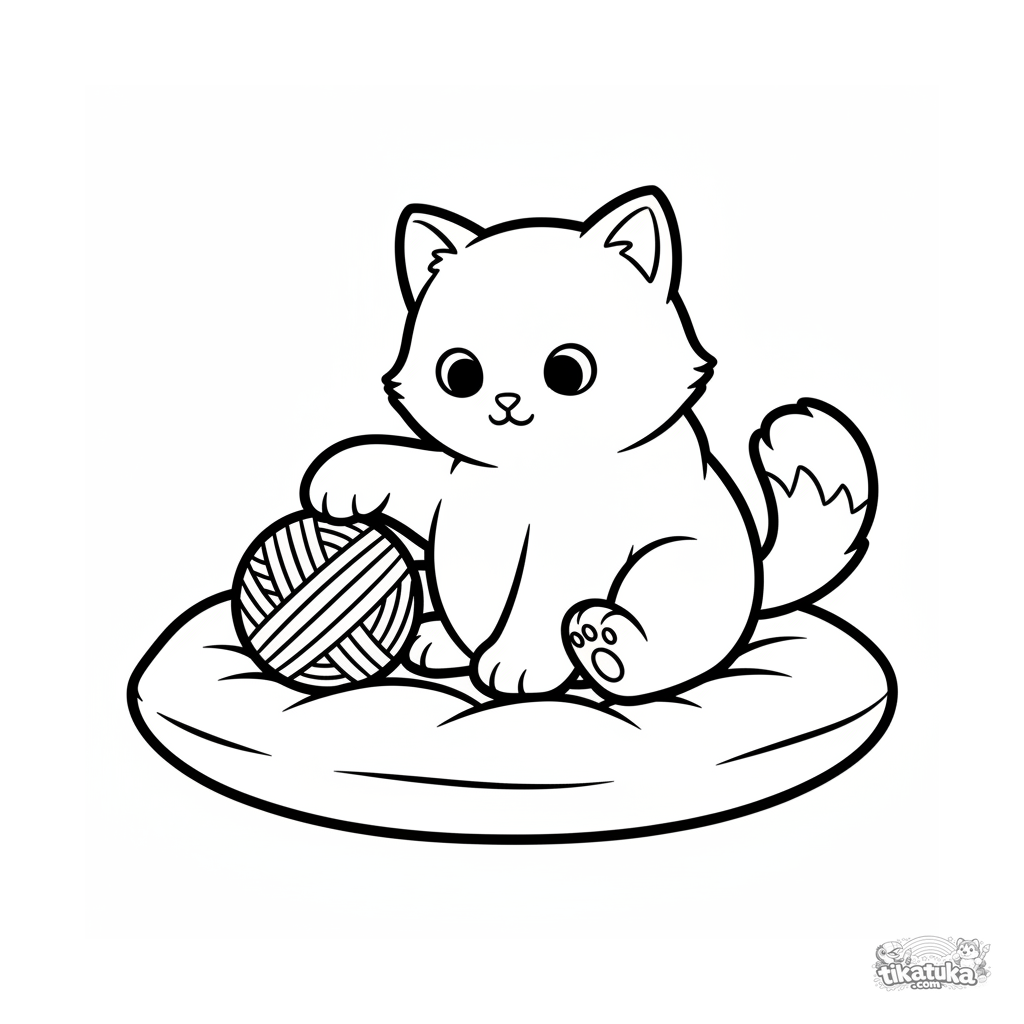 Página para colorir realista para bebês: um gatinho brinca com novelo em um travesseiro. Contornos simplificados, formas grandes, para 2-3 anos.
