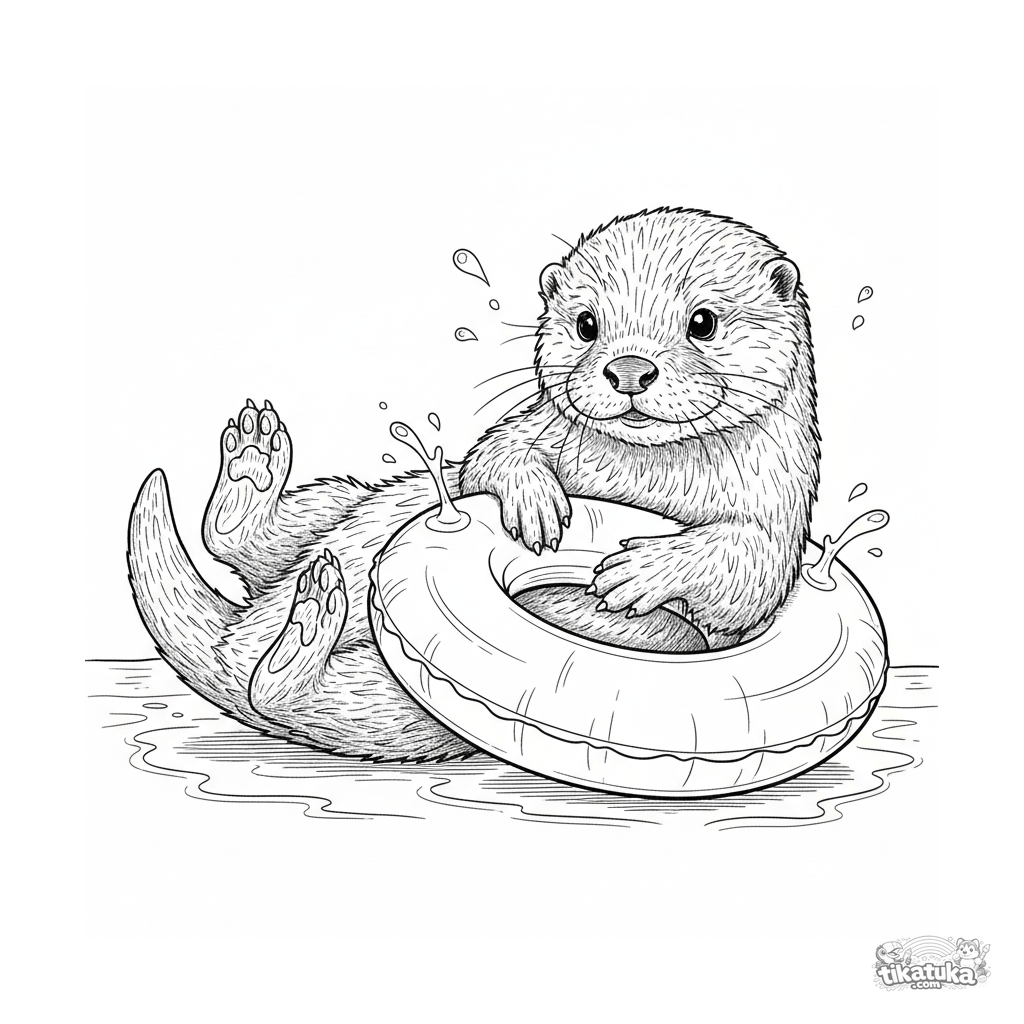Página intrincada e realista para colorir para crianças de 10 a 12 anos: um filhote de lontra brinca com um anel inflável no fundo da piscina.