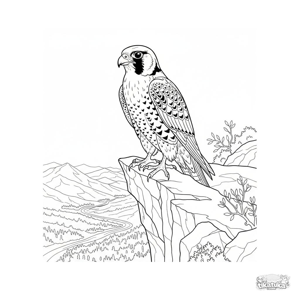 Página para colorir para crianças maiores 7-12: um falcão peregrino realista pousado na borda de um penhasco rochoso. Alto detalhe nas penas e paisagem.