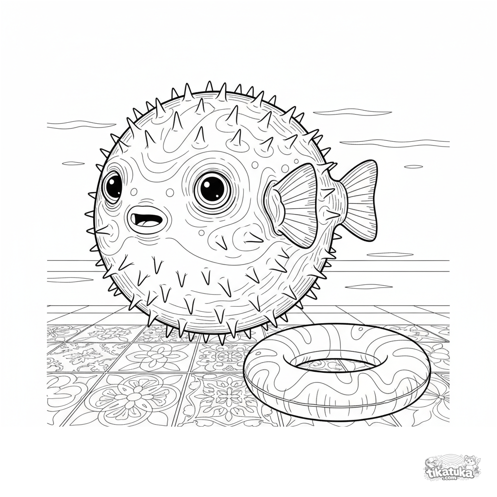 Página para colorir complexa para crianças maiores de 10-12 anos: um baiacu realista em estilo de gravura antiga se infla no fundo da piscina. Espinhos detalhados e textura da pele.