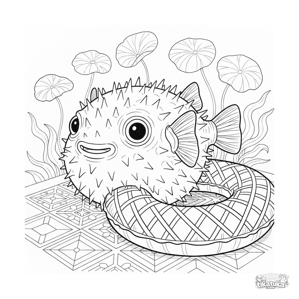 Página detalhada para colorir em estilo realista: um baiacu descansa nos azulejos perto de um anel inflável no fundo da piscina.