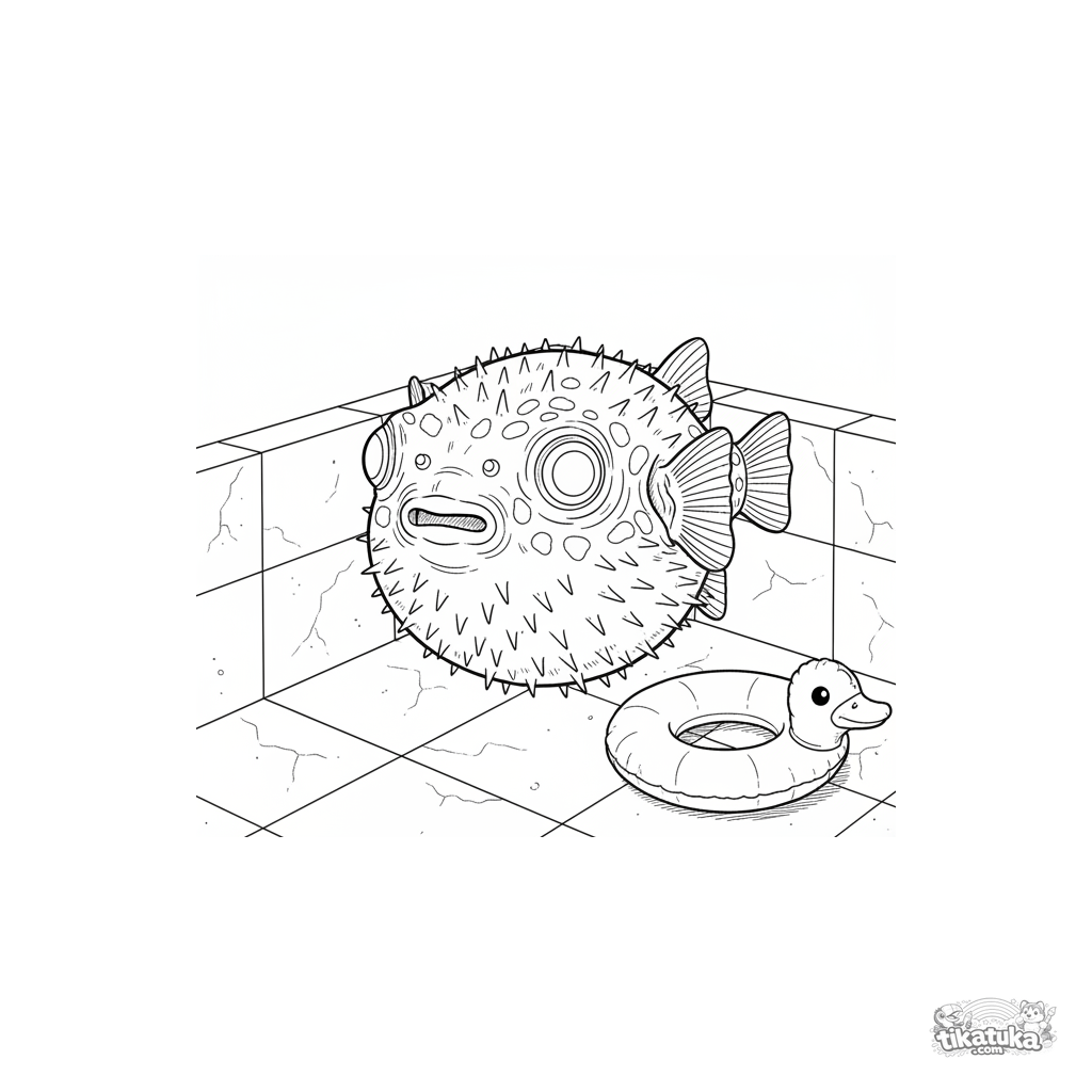 Página intrincada para colorir de um baiacu realista no canto de uma piscina. Para crianças mais velhas de 10 a 12 anos.