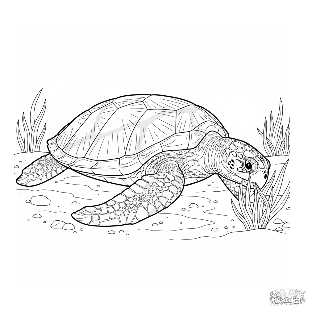 Página para colorir realista complexa para crianças maiores 10-12: tartaruga-marinha pastando no capim-marinho em lagoa ensolarada. Alto detalhe.
