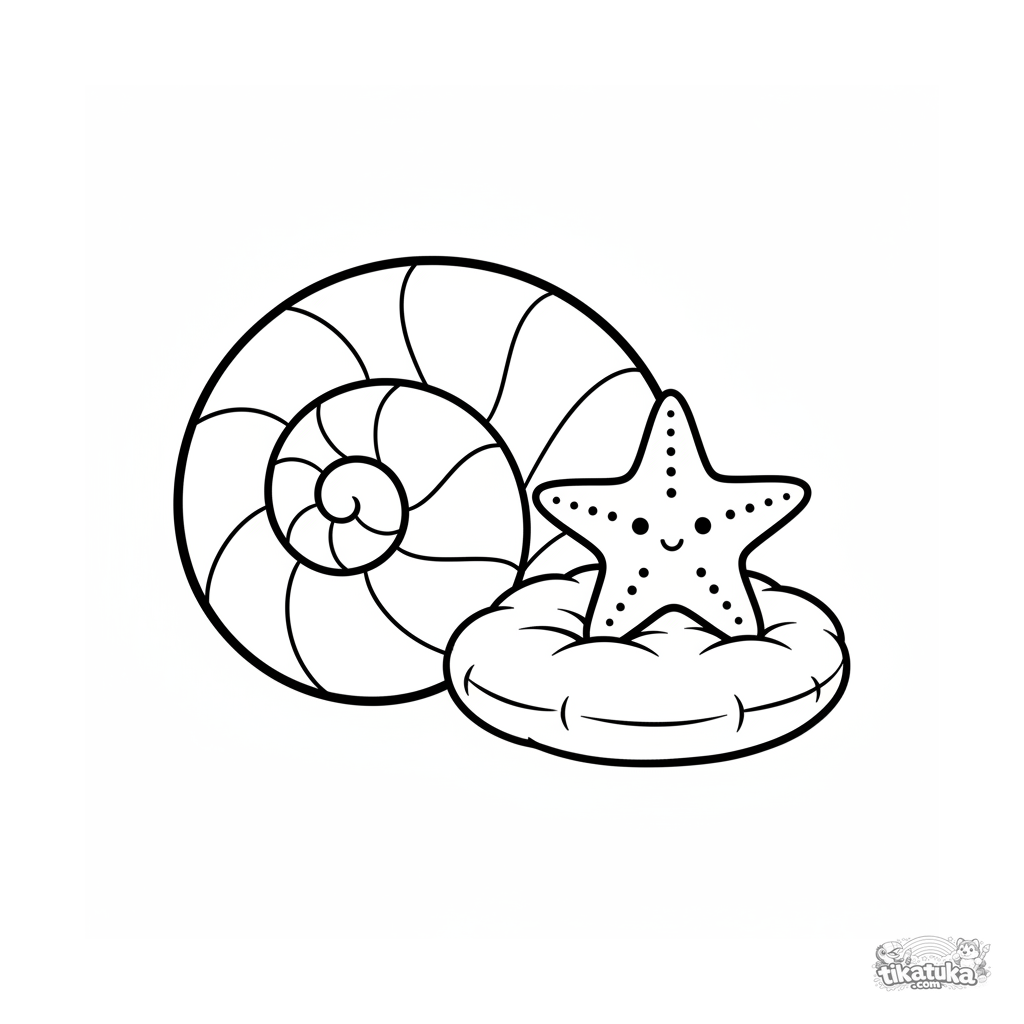 Página para colorir realista simples: uma grande concha do mar em espiral e uma estrela-do-mar sorridente repousam em um travesseiro macio. Formas grandes para crianças de 2-3 anos.