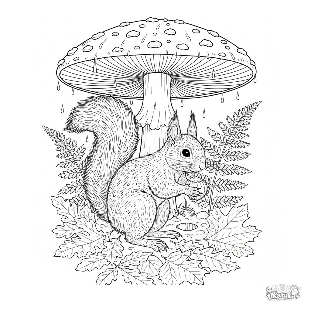 Página para colorir para crianças maiores 10-12: um esquilo realista esconde uma noz sob um cogumelo em uma floresta de outono durante a chuva.