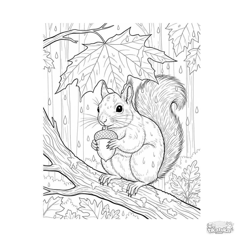 Página realista detalhada para colorir para 10-12 anos: um esquilo usa uma folha de bordo como guarda-chuva segurando uma bolota na chuva da floresta de outono.