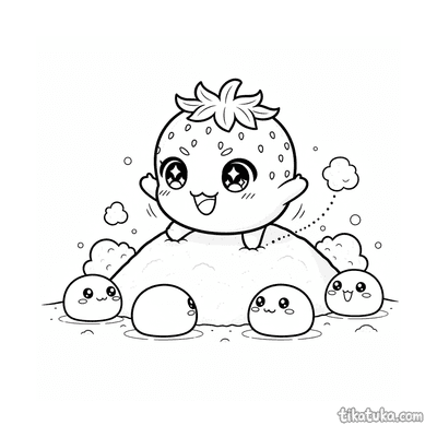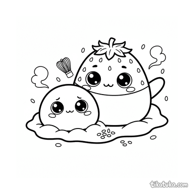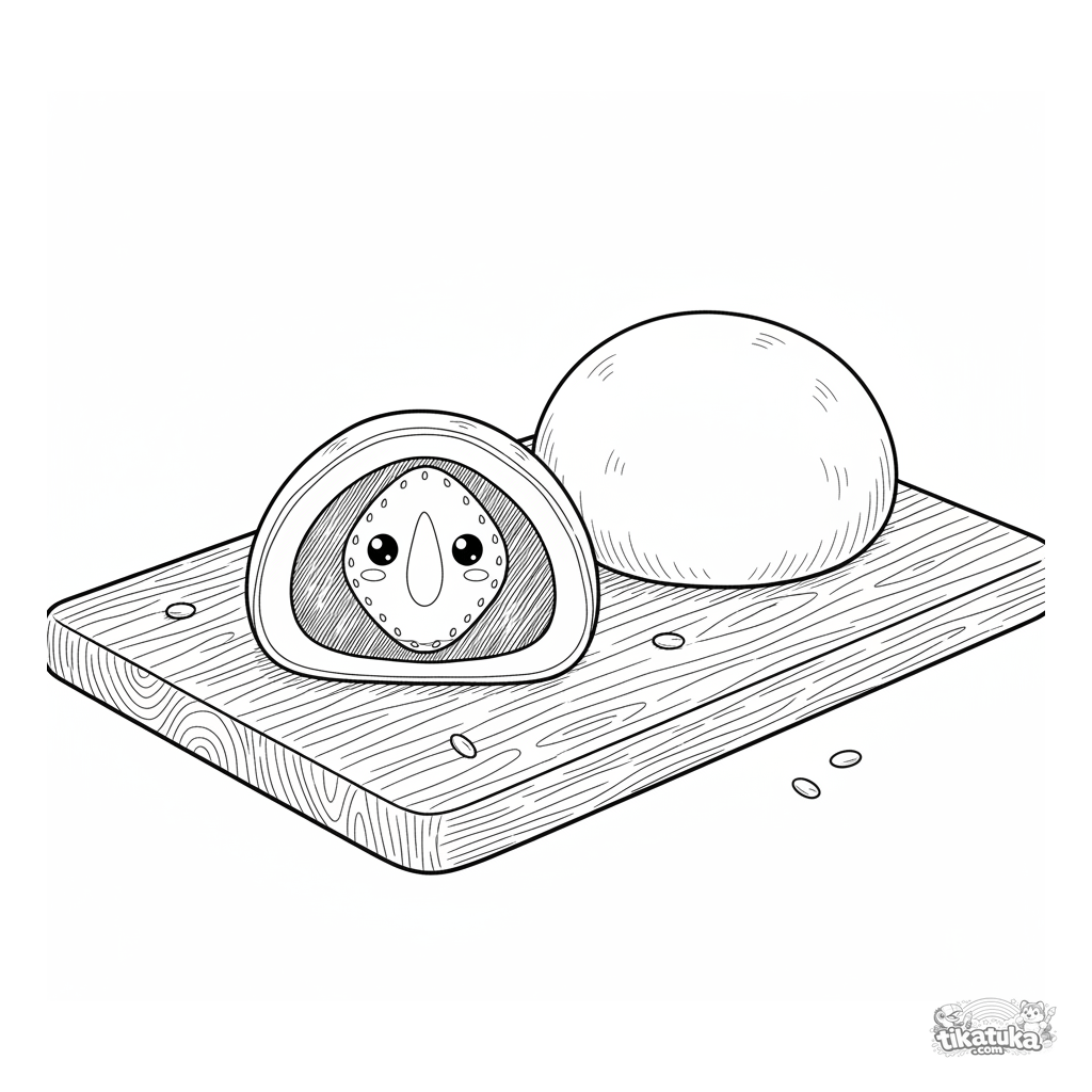 Página para colorir realista detalhada para crianças mais velhas de 10-12 anos: um corte transversal preciso de um mochi de morango revelando sua estrutura interna. Cena educativa e bonita.