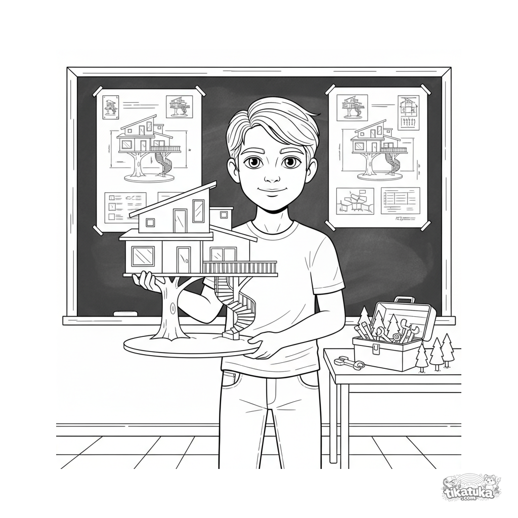 Página para colorir para 7-9 anos: estudante de arquitetura na sala apresentando uma maquete de casa na árvore. Estilo realista, projetos detalhados no quadro.