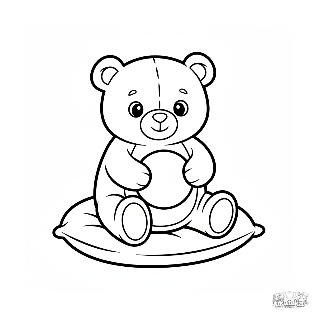 Página para colorir realista para bebês: um urso de pelúcia sentado em um travesseiro, segurando uma bola lisa. Contornos claros.