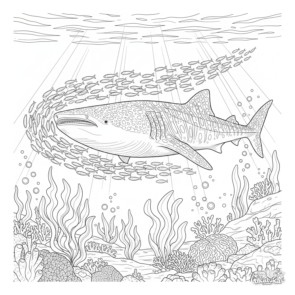 Página para colorir detalhada de um tubarão-baleia nadando através de um recife de coral colorido. Para crianças mais velhas de 7 a 12 anos. Apresenta corais, cardumes de peixes e raios de luz subaquáticos.
