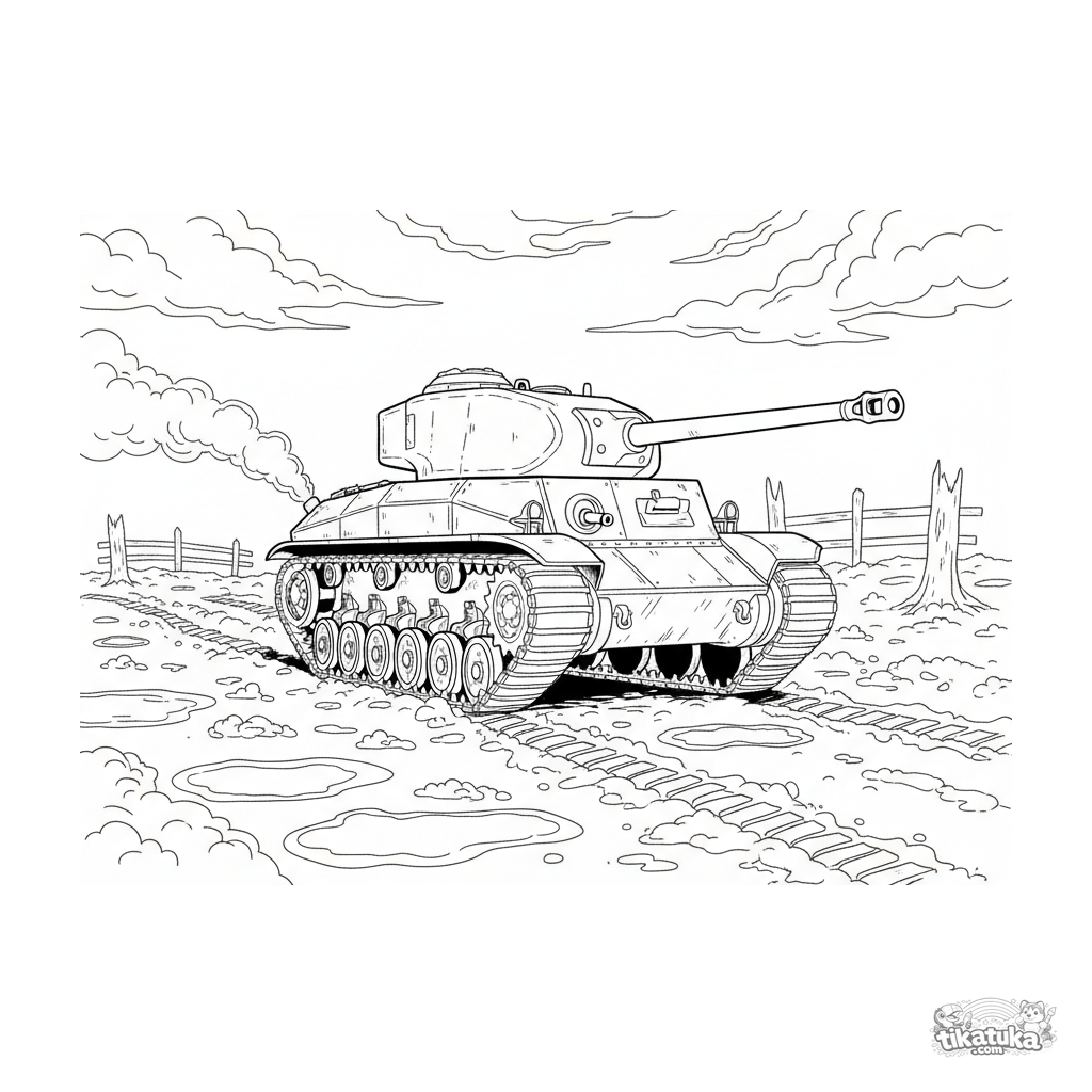 Página para colorir de um tanque realista da Segunda Guerra Mundial num campo lamacento. Para meninos de 7 a 12 anos.