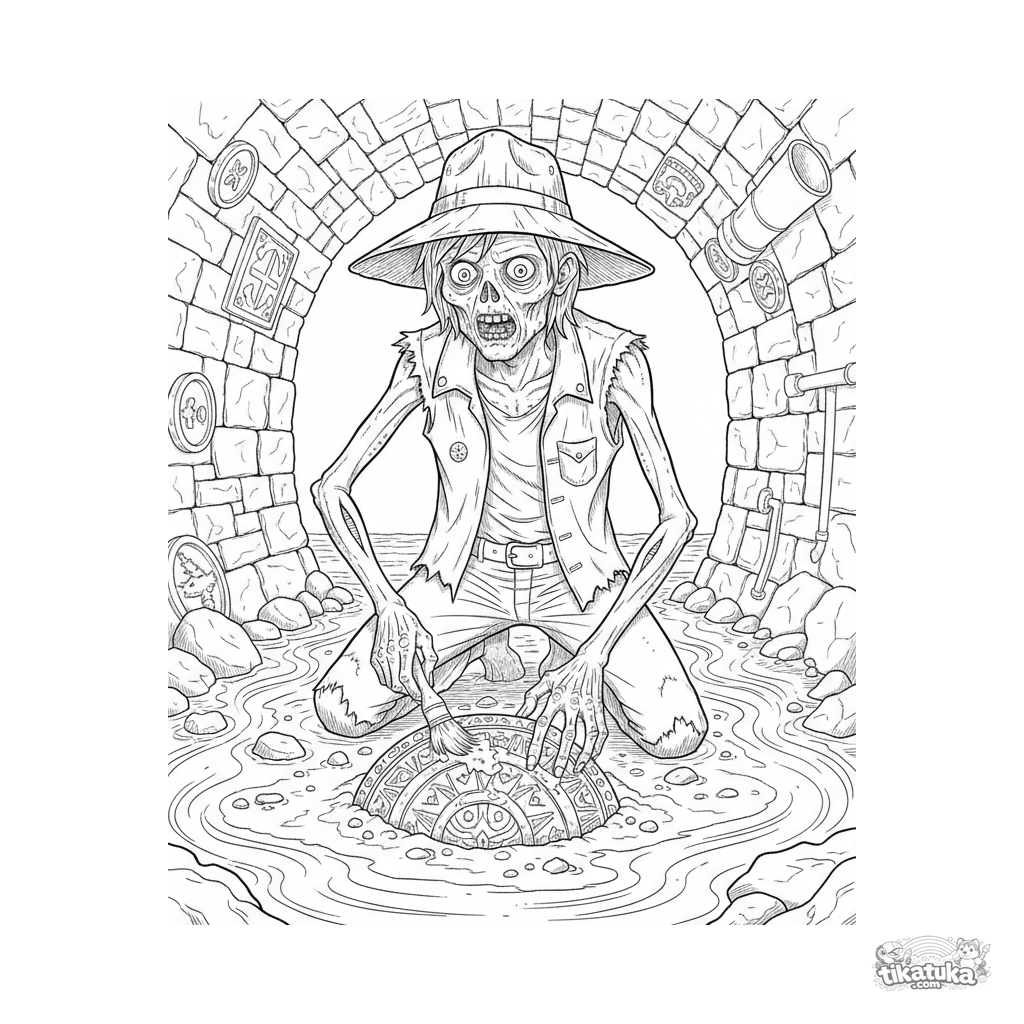 Página complexa para colorir para crianças de 10-12 anos: um zumbi arqueólogo realista descobrindo um artefato em um canal de esgoto. Estilo de gravura vintage.