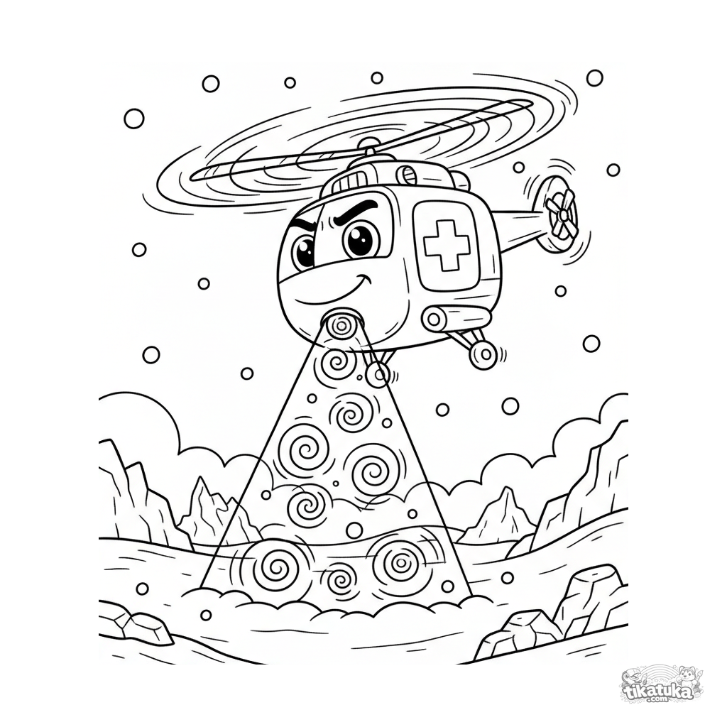 Página para colorir para crianças de 4 a 6 anos: um helicóptero de resgate em uma tempestade de neve ártica. Cena dinâmica, formas claras.