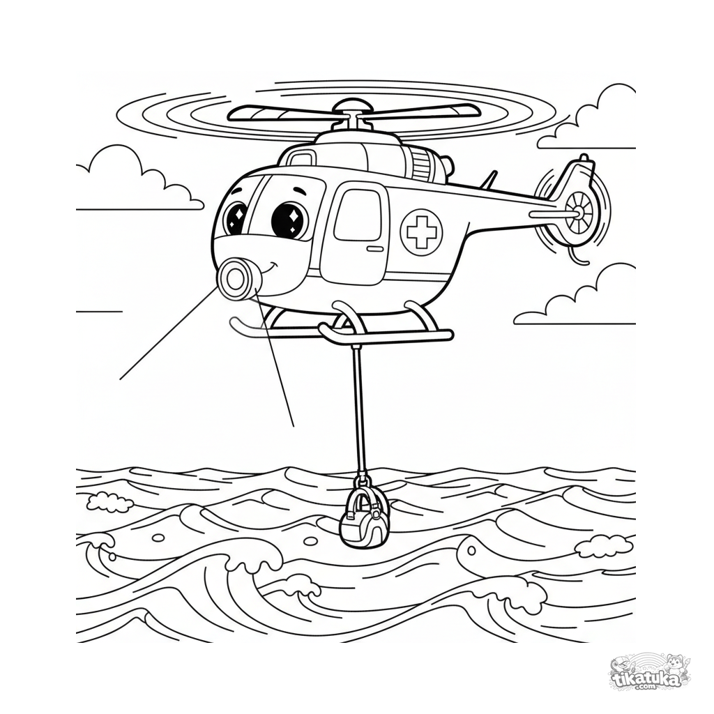 Página para colorir de um helicóptero de resgate pairando sobre o oceano. Para crianças de 7 a 9 anos. Contornos fortes, pose dinâmica.