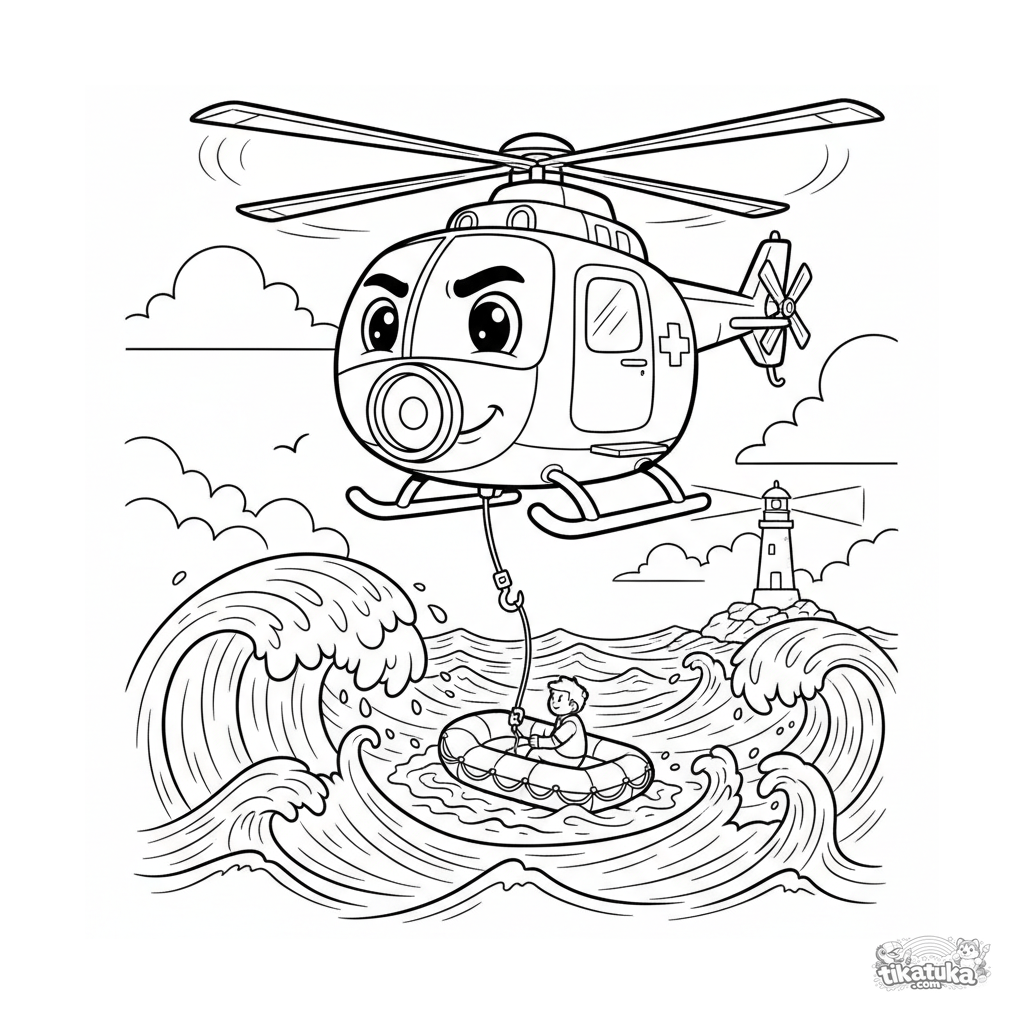 Página para colorir de um helicóptero de resgate pairando sobre um oceano tempestuoso. Para crianças de 4 a 6 anos. Cena dinâmica, formas claras.