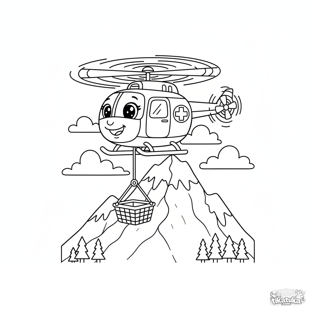 Página para colorir para crianças de 4-6 anos: um helicóptero de resgate amigável pairando perto de uma montanha nevada. Formas claras e detalhes moderados.