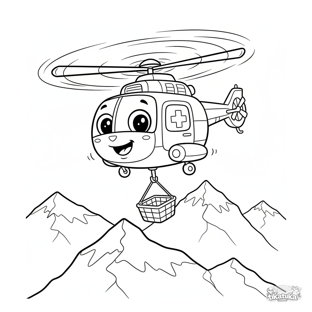 Página para colorir de um helicóptero de resgate pairando sobre montanhas nevadas. Para crianças de 4-6 anos. Helicóptero com janelas sorridentes e cesto de resgate. Formas simples e claras.