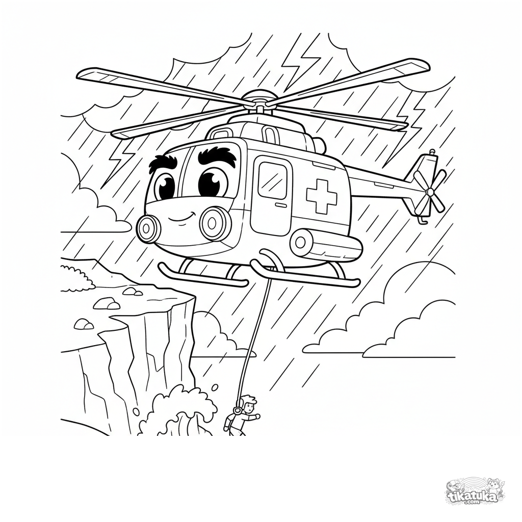 Página para colorir dinâmica de um helicóptero de resgate operando em uma tempestade perto de um penhasco rochoso. Para crianças de 7 a 9 anos. Linhas expressivas, cena dramática.