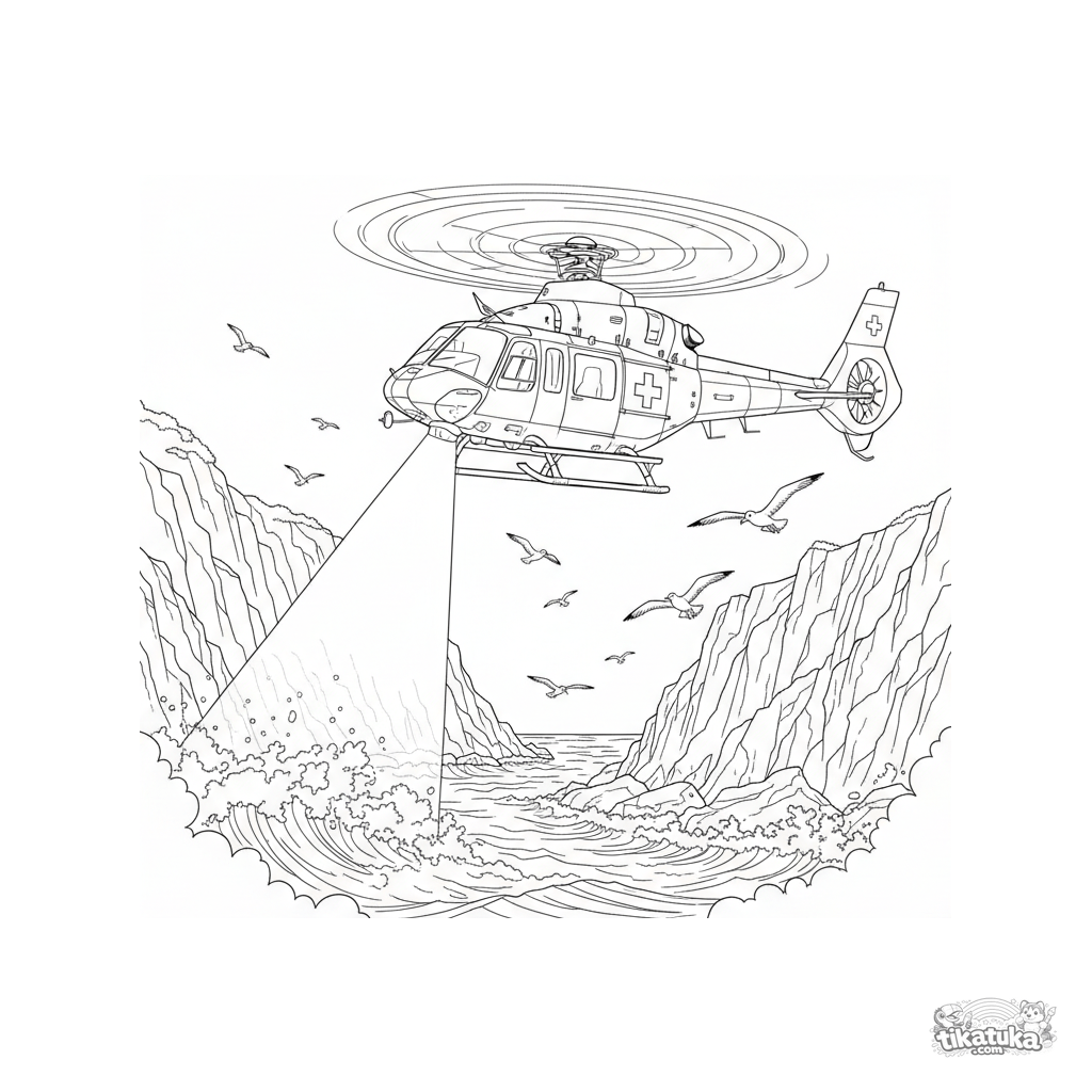 Página para colorir detalhada de um helicóptero de resgate com holofote no nevoeiro perto de penhascos costeiros. Para crianças mais velhas de 10 a 12 anos.