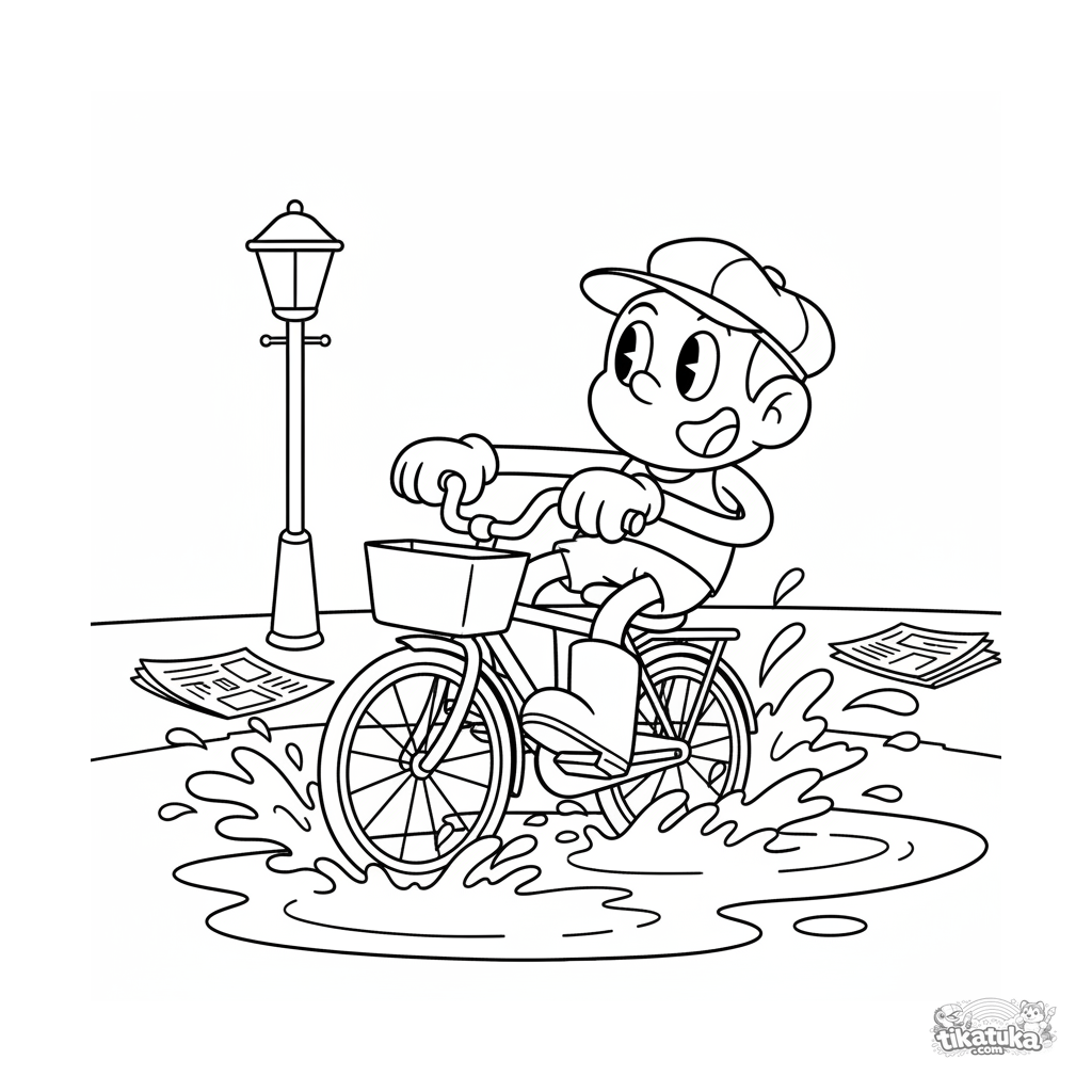 Página para colorir para crianças de 7-9 anos estilo retrô anos 30: um personagem alegre de bicicleta passa por uma poça em uma rua de outono. Pose dinâmica, respingos.