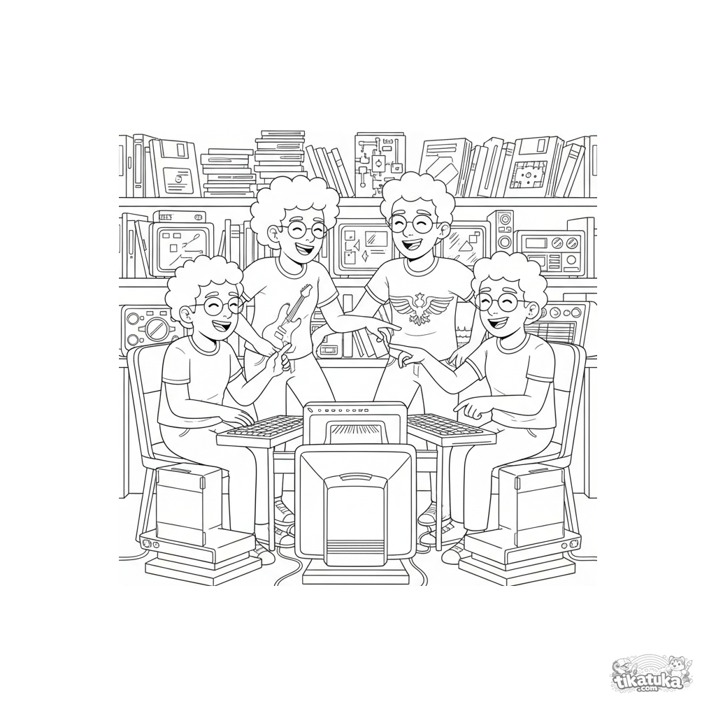 Página para colorir detalhada para 10-12 anos: reunião de um clube de computadores retrô no porão. Amigos em volta de monitores antigos, disquetes, manuais.