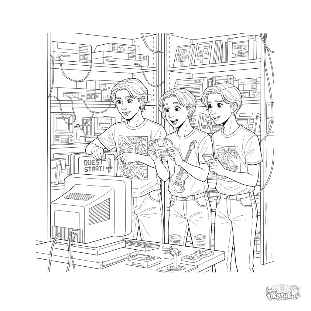 Página para colorir para crianças de 10-12 anos: um encontro do clube de computadores retrô em um porão, onde amigos examinam monitores antigos, disquetes e cartuchos de jogos.