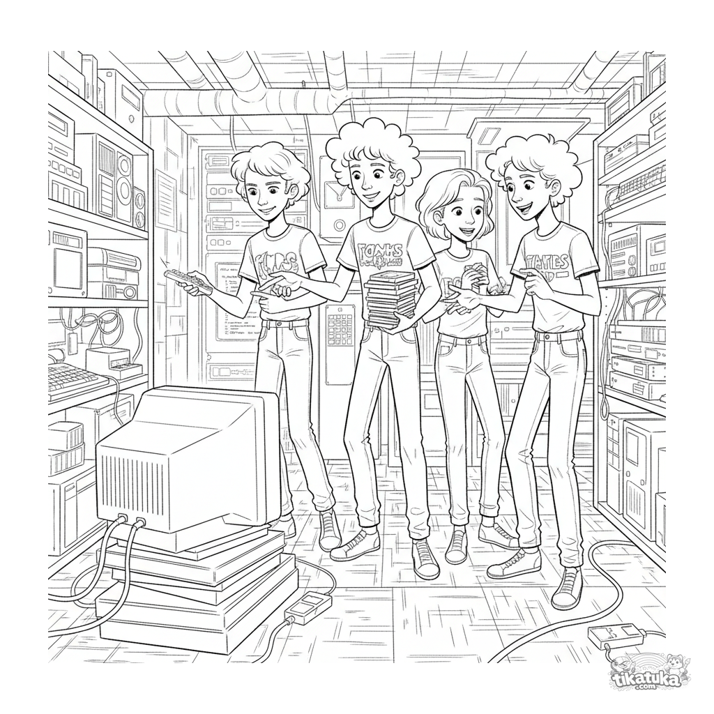 Página para colorir para 10-12 anos: reunião de um clube de computadores retro em uma sala de servidores. Adolescentes discutem código entre monitores antigos. Cena detalhada.
