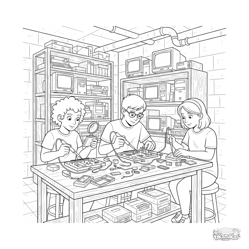 Página para colorir para 10-12 anos: membros de um clube de computadores retro soldam placas em um porão. Ferramentas detalhadas, monitores antigos e tecnologia para colorir intrincado.