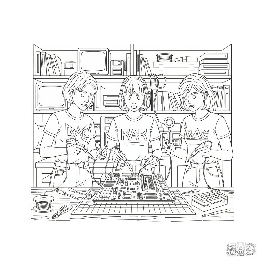 Página para colorir detalhada: três amigos consertando um computador retro em um clube no porão. Cena com ferro de solda, monitores, ferramentas.
