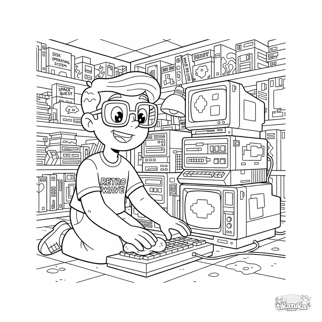 Página para colorir para 10-12 anos: um colecionador de computadores retro em um arquivo de porão. Cena detalhada com monitores antigos, disquetes, caixas.