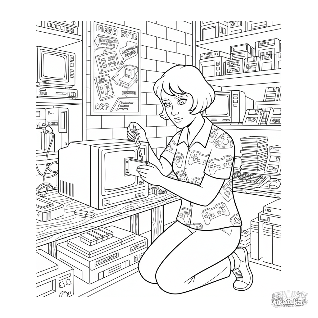 Página para colorir para crianças de 10-12 anos: um colecionador de tecnologia retro conserta um computador antigo em uma oficina no porão. Cena detalhada em estilo guia de campo.