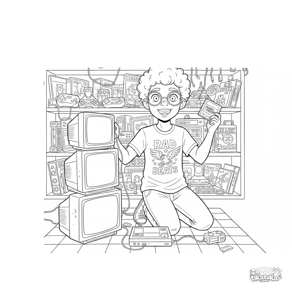 Página para colorir para crianças de 10-12 anos: um colecionador de tecnologia retrô testando consoles antigos em um porão cheio de monitores, cartuchos e caixas de jogos.