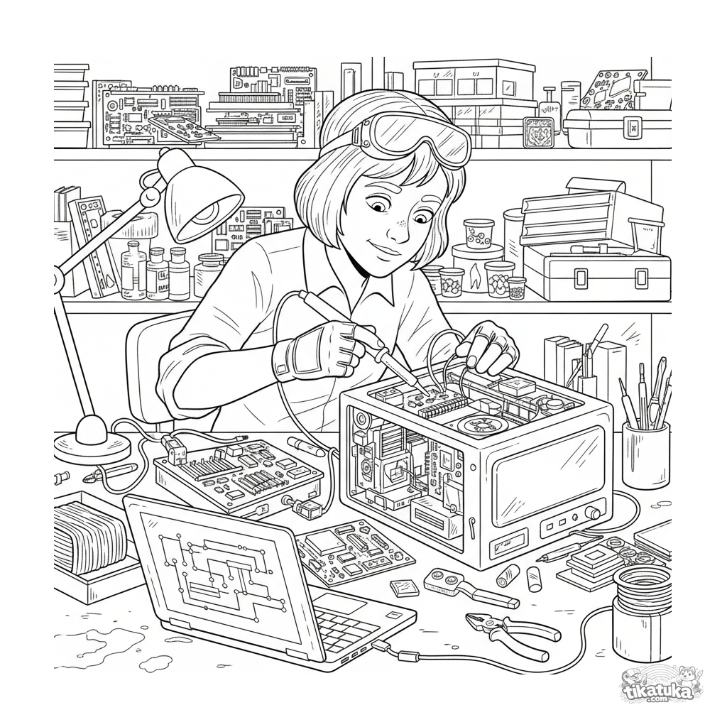 Página para colorir detalhada: um modificador de computador retrô trabalhando em uma oficina no porão. Muitos elementos: ferramentas, esquemas, peças.