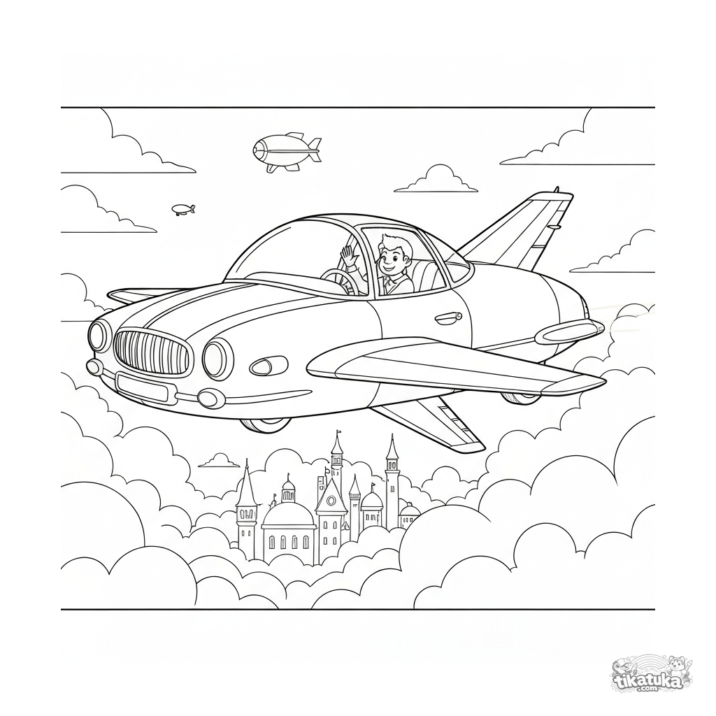 Página para colorir intrincada de um carro voador retrô detalhado sobrevoando uma cidade nas nuvens. Para maiores de 8 anos.