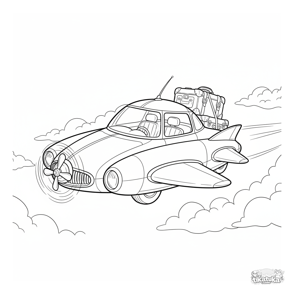 Página para colorir de um carro voador retro-futurista detalhado sobre as nuvens. Para crianças de 8 a 12 anos.
