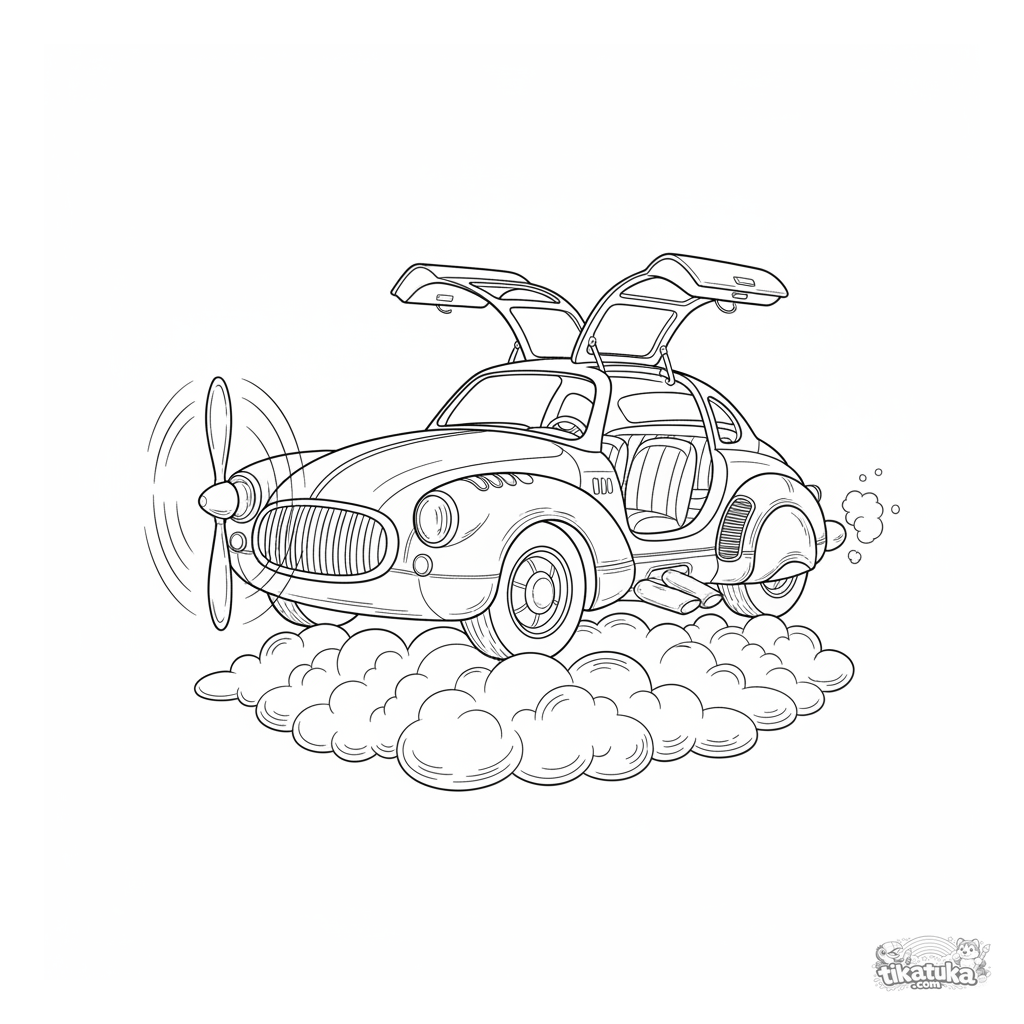Página detalhada para colorir de um carro voador retrô pairando sobre nuvens. Para crianças de 6 a 9 anos. Design realista.