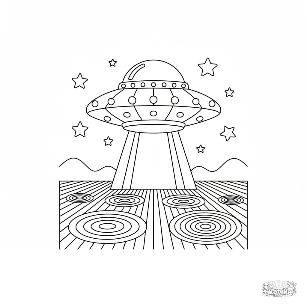 Página para colorir para crianças de 4-6 anos: um disco voador retrô pairando sobre círculos misteriosos em uma plantação.