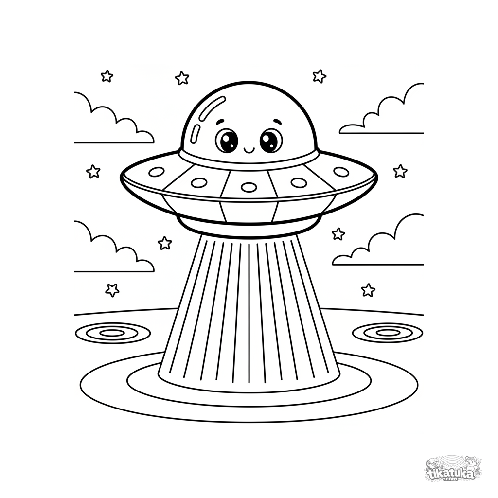 Página para colorir para meninos de 4-6 anos: um disco voador retrô paira sobre círculos nas plantações. Cena interessante com detalhes claros para colorir.