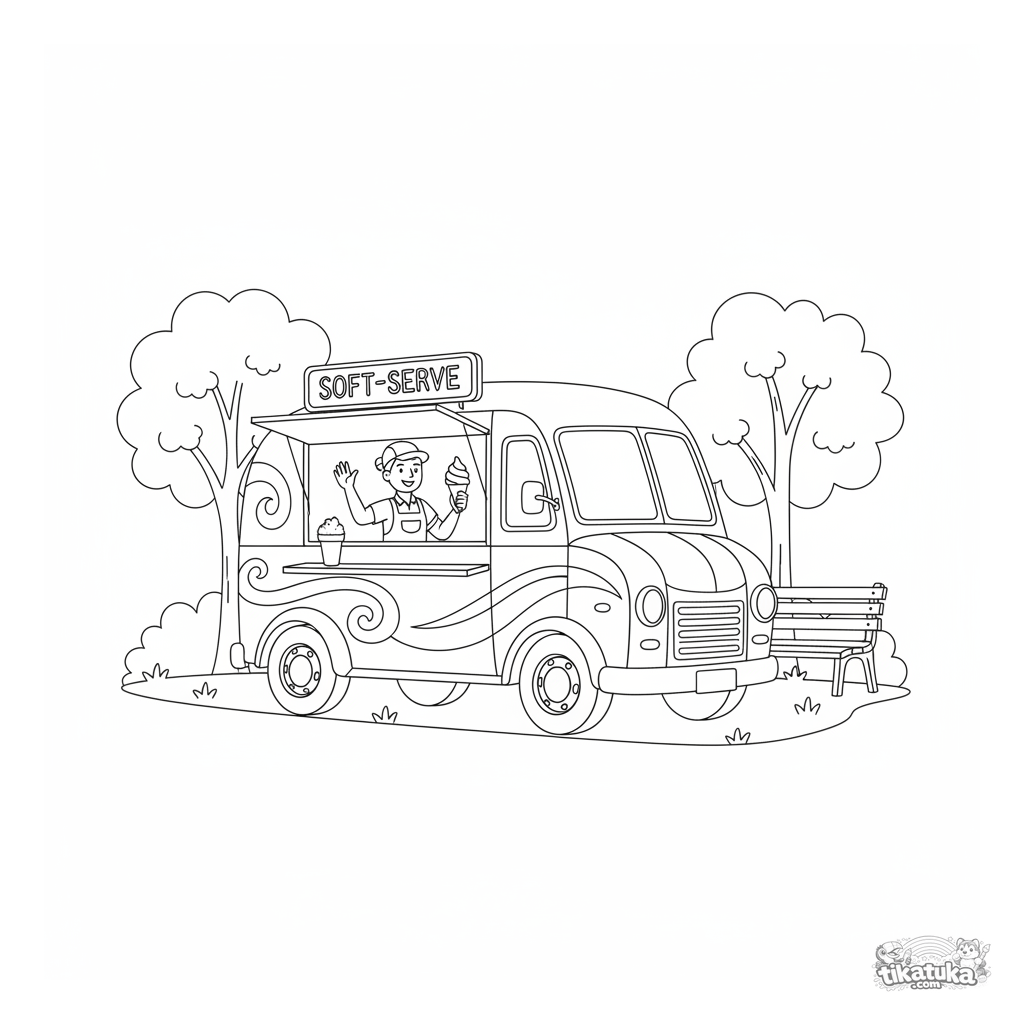 Página para colorir de estilo realista para meninos 4-6: um caminhão de comida retrô servindo sorvete em um parque da cidade. Detalhes moderados e formas reconhecíveis.