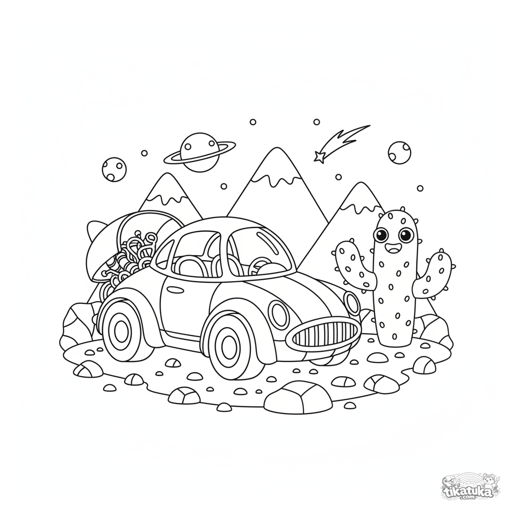 Página para colorir para meninos 4-6: um carro foguete retro-futurista estacionado em uma paisagem marciana.